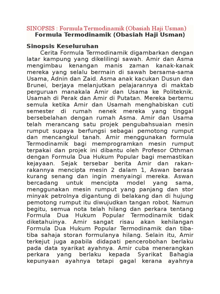 Namun begitu semua nota telah hilang dan perkara tentang Formula Dua Hukum Popular Termodinamik tidak diketahuinya. TERIMA KASIH NOVEL FORMULA TERMODINAMIK SINOPSIS Novel Formula Termodinamik ini berlatarbelakangkan Kampung Warisan di Papar.